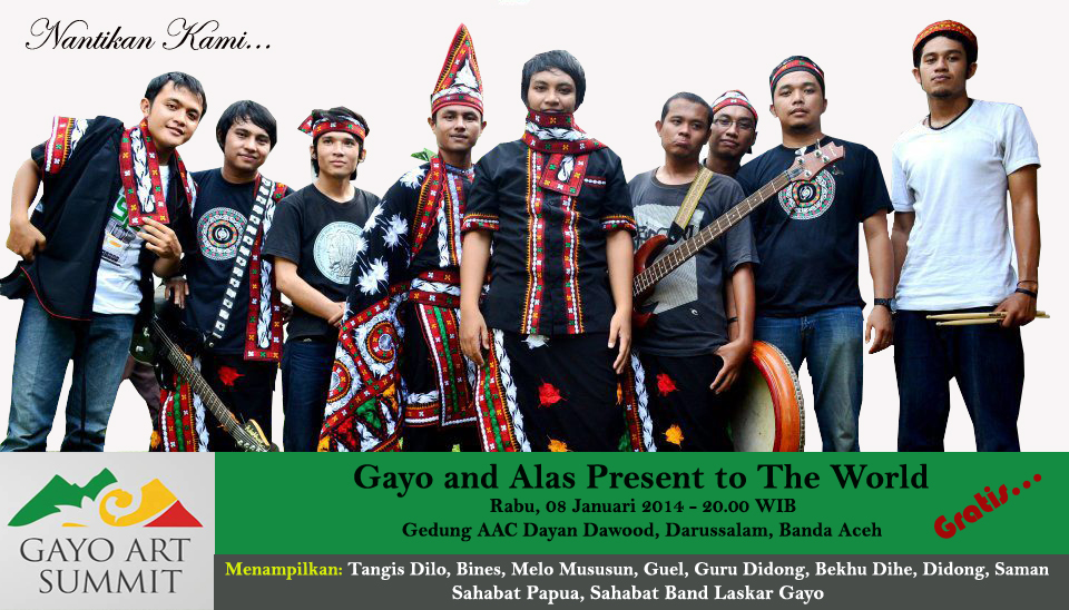 Banda Aceh – LintasGayo.co : Penampilan kolaborasi Tari Saman dan Guel dengan band etnik Laskar Gayo akan menjadi salah satu rangkaian dari sejumlah penampilan budaya asal suku Gayo dan Alas dalam acara Gayo Art Summit yang akan digelar pada Rabu (08 Januari 2014), pukul 20.00 WIB di Gedung AAC Dayan Dawood, Darussalam, Banda Aceh.