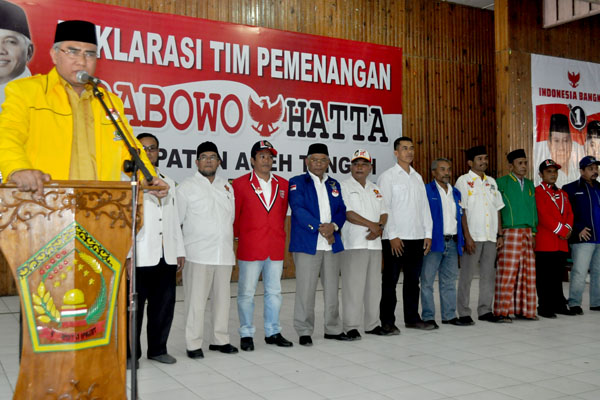 “Kita targetkan suara 70 persen saja, tidak usah besar-besar, karena target kecil untuk hasilkansuara yang besar,” kata ketua tim pemenangan Nasaruddin dihadapan ratusan simpatisan yang menghadiri deklarasi menangkan Prabowo-Hatta digedung Olah Seni (GOS), jalan Sengeda, Kota Takengon, Rabu (25/6/2014) petang.