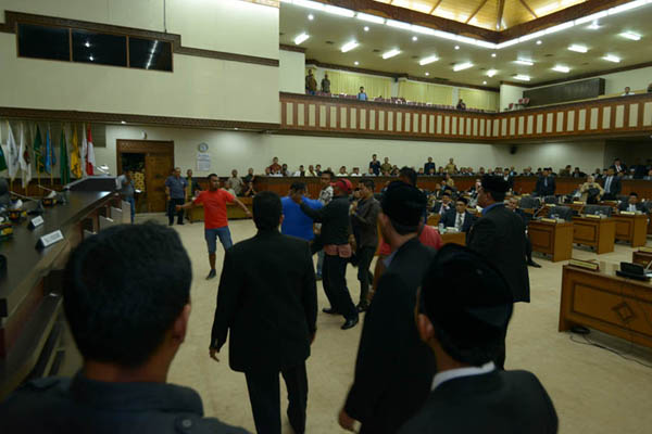 Saat sedang bersitegang, tiba-tiba 10 orang yang disebut-sebut sebagai anak buah Nek Tu maju ikut maju ke depan dan berteriak-teriak di depan pimpinan dewan sementara.