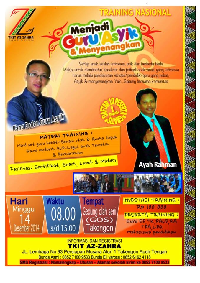 Takengon-LintasGayo.co : Taman Kanak-Kanak Islam Terpadu (TK IT) Az Zahra Takengon, Minggu 14 Desember 2014 mendatang akan menggelar Training Nasional bertemakan Menjadi Guru Asik dan Menyenangkan, demikian disampaikan ketua panitia yang juga kepala sekolah TK IT Az Zahra, Ida Nusraini, S.Pd Aud, Senin (8/12/2014).