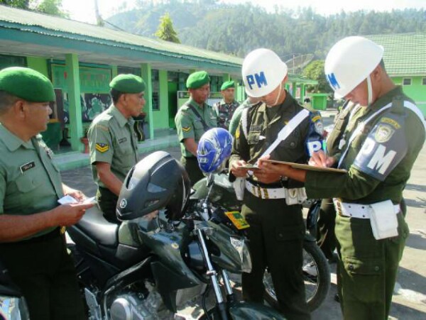 Acara di anjutkan dengan pengecekan kelengkapan kendaraan dinas baik SIM, surat kendaraan maupun kelengkapan kendaraan Prajurit Kodim 0106 oleh Personil dari Polisi Militer 1-5/AT.