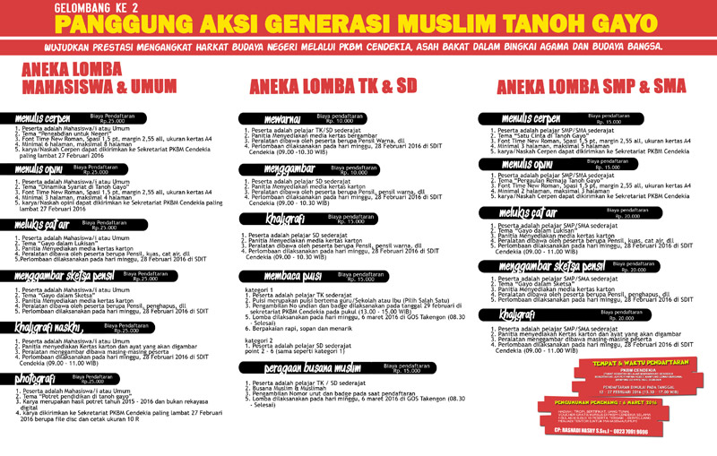 DALAM rangka meningkatkan kualitas Generasi Muda Tanoh Gayo yang berprestasi, Pusat Kegiatan Belajar Masyarakat (PKBM) Cendikia menggelar aneka lomba untuk Pelajar, Mahasiswa dan Umum untuk gelombang ke 2.