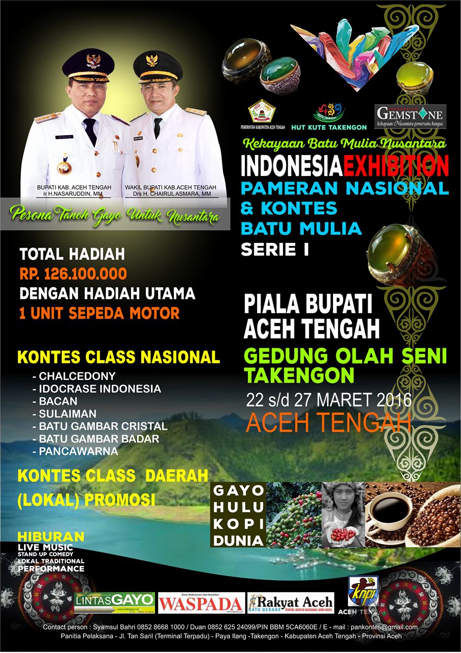 Kontes batu mulia di Takengon adalah dalam rangka memeriahkam HUT ke-439 Kota Takengon memperebutkan piala Bupati Aceh Tengah, dengan total hadiah 116 Juta Rupiah.