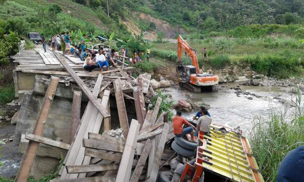 “Sudah 3 hari jembatan ke desa kami rusak akibat dilintasi truk hingga jatuh, Kami terpaksa masuk ke sungai jika ingin melintas,” ungkap Arman, warga setempat, Kamis 8 Agustus 2016.