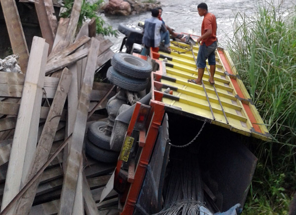 Pining-LintasGayo.co : Akibat melintasi jembatan darurat berkontruksi kayu, satu unit kenderaan roda enam jenis colt diesel terjungkal ke sungai di desa Ekan Kecamatan Pining Gayo Lues.