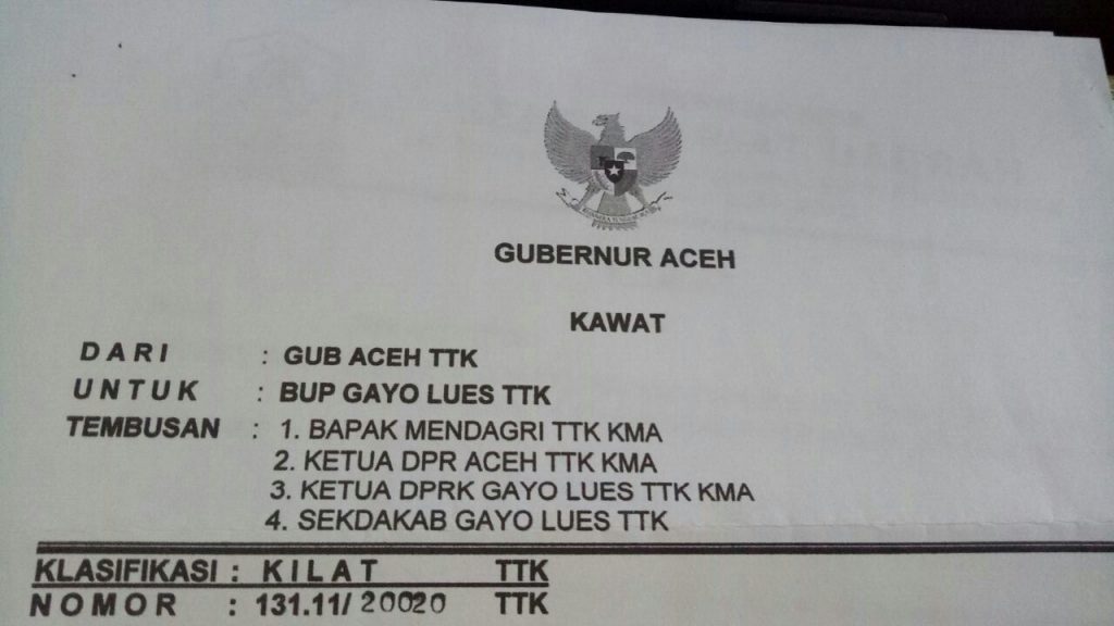 BLANGKEJEREN-LintasGAYO.co : Sehubungan dengan akan berakhirnya masa jabatan Bupati dan Wakil Bupati Gayo Lues, melalui surat Kawat Nomor 131.11.20020, Gubernur Aceh menunjuk Sekretaris Daerah Kabupaten Gayo Lues, H. Thalib, S.Sos, M.AP sebagai pelaksana tugas harian Bupati Gayo Lues untuk mengisi kekosongan pimpinan pemerintahan di kabupaten tersebut.