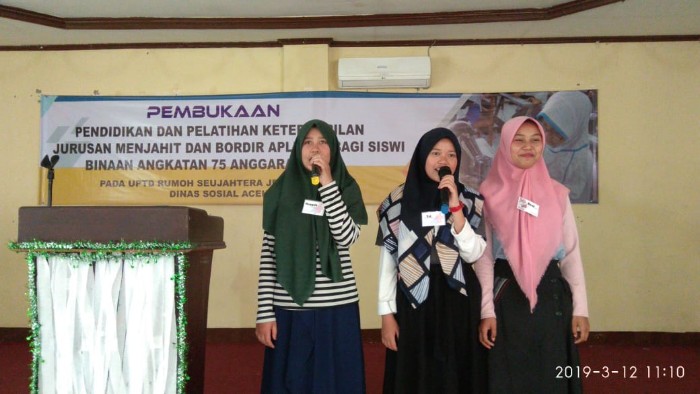 BANDA ACEH-LintasGAYO.co : Kepala Dinas Sosial Aceh Drs Alhudri MM, membuka secara resmi pelatihan keterampilan menjahit dan membordir untuk 30 orang siswi binaan angkatan ke 75 Unit Pelayanan Teknis Dinas (UPTD) Rumoh Seujahtra Jroh Naguna (RSJN), Lampineng, Banda Aceh, Senin (11/3/2019).