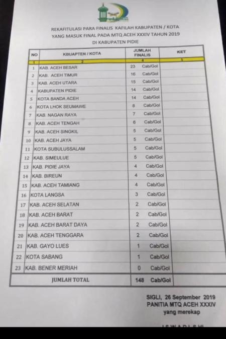 Berikut daftar kab/kota yang lolos ke babak final MTQ ke-34 Provinsi Aceh :