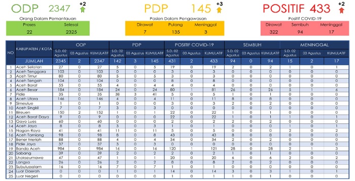 Dengan tambahan dua kasus positif, Aceh kini mencatat 433 kasus, dengan 322 orang masih dirawat, 94 orang sembuh dan 17 orang meninggal dunia.