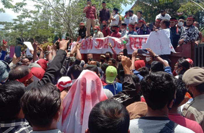 REDELONG-LintasGAYO.co : Massa yang menamakan diri aliansi masyarakat Bener Meriah melakukan aksi di Gedung DPRK setempat tepat di hari HUT ke-75 Republik Indonesia, Senin 17 Agustus 2020.