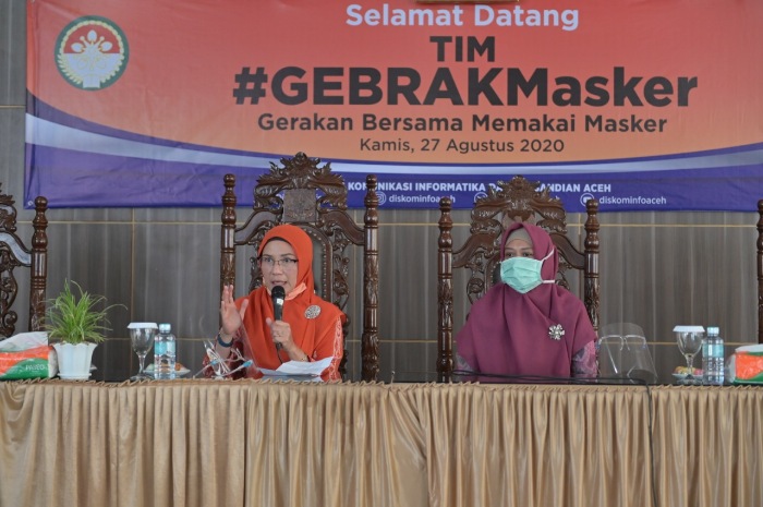 Banda Aceh-LintasGAYO.co : Ketua Dharma Wanita Persatuan (DWP) Aceh, Safrida Yulianti melaksanakan kampanye Gerakan Bersama Pakai Masker atau biasa disebut Gebrak Masker ke Dinas Komunikasi, Informasi dan Persandian (Diskominsa) Aceh, Kamis (27/8/2020).
