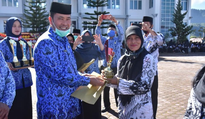 Redelong-LintasGAYO.co : Bupati Bener Meriah Tgk. H. Sarkawi yang diwakili oleh Sekretaris daerah Bener Meriah Drs. Haili Yoga, M.Si memberikan penghargaan kepada guru, kepala sekolah, dan pengawas sekolah berprestasi dan berdedikasi tingkat TK, SD, SMP Tahun 2020 pada peringatan HUT Korpri Ke 49, HGN, dan HUT PGRI Ke-75, Senin (30-11-2020)