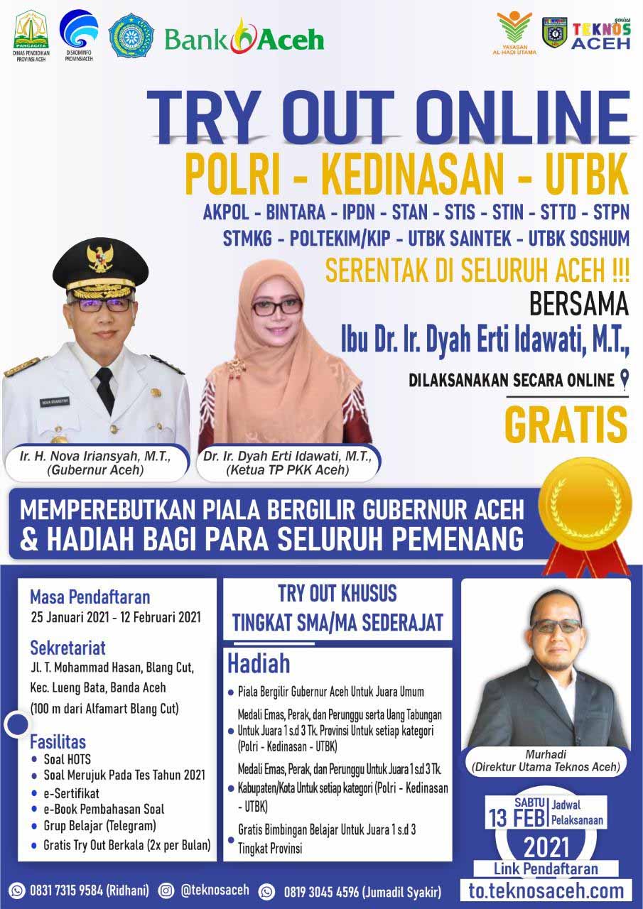 Banda Aceh, LintasGAYO.CO – Praktisi pendidikan, Dr. Ir. Dyah Erti Idawati, M.T bekerjasama dengan Lembaga Teknos akan melaksanakan try out online bagi siswa SMA sederajat se Aceh. Kegiatan ini memperebutkan piala bergilir Gubernur Aceh yang akan dilaksanakan serentak pada 13 Februari 2021.