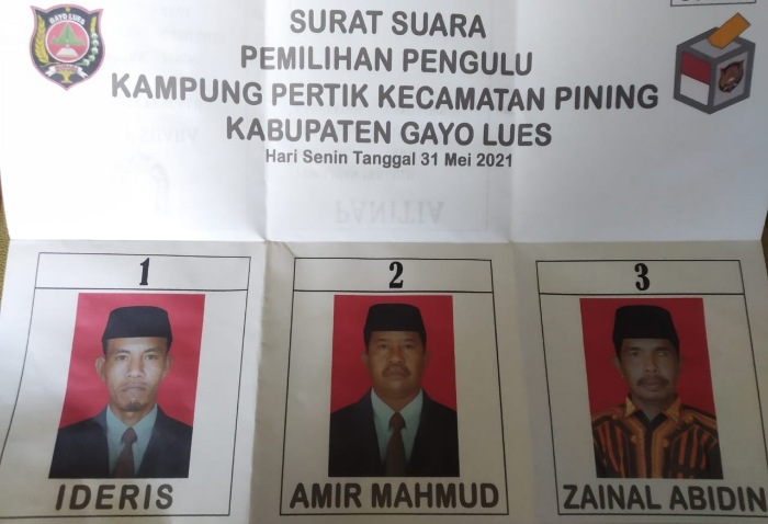 Pemilihan Penghulu Kampung Pertik diikuti 3 calon, Idris nomor urut 1, Amir Mahmud nomor urut 2 dan Zainal Abidin nomor urut 3.