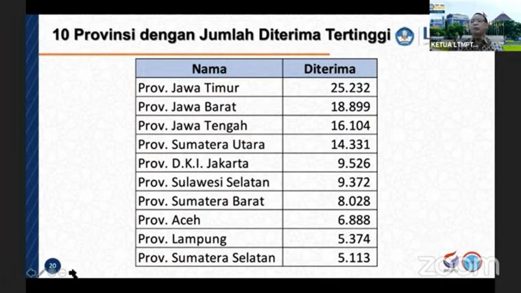 Muhammad Nasih mengumumkan ada 10 provinsi dengan jumlah peserta terbanyak diterima pada SBMPTN 2021. Secara nasional Provinsi Jawa Timur menjadi posisi pertama dengan jumlah 25.232 peserta, posisi kedua Jawa Barat 18.899 peserta dan Jawa Tengah di posisi ketiga dengan jumlah 16.104 peserta.