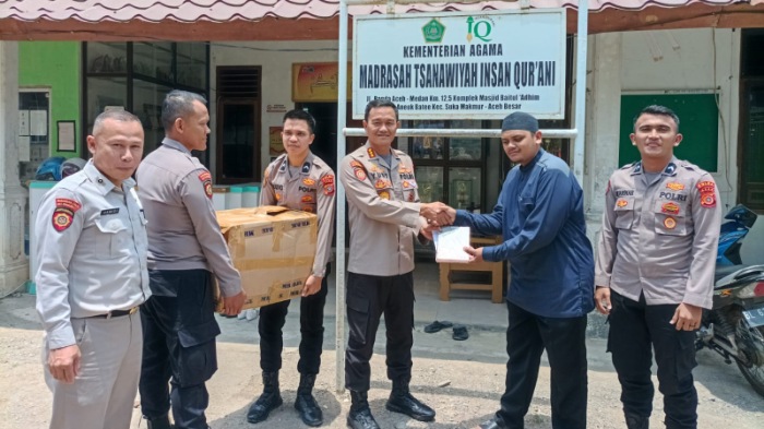 ACEH BESAR-LintasGAYO.co : Personel Direktorat Pengamanan Objek Vital (Ditpamobvit) Polda Aceh menyerahkan 72 mushaf Alquran untuk Dayah Insan Qurani Aceh Besar, Senin, 17 April 2023.