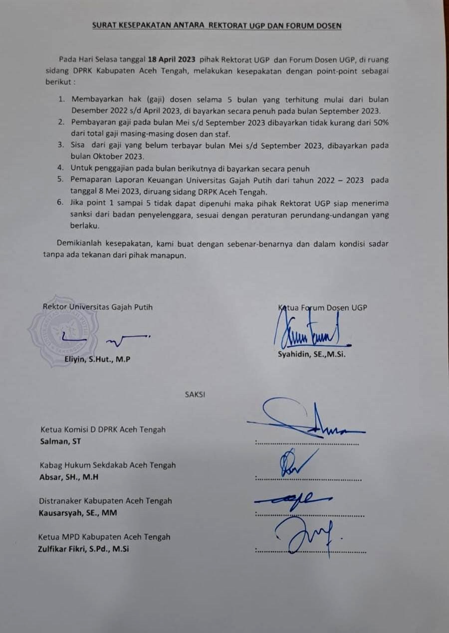 TAKENGON-LintasGAYO.co : Pertemuan hari kedua antara pihak Rektorat dan Forum Dosen Universitas Gajah Putih (UGP) Takengon, di gedung DPRK Aceh Tengah menghasilkan beberapa kesepakatan, Selasa 18 April 2023