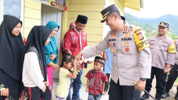 TAKENGON-LintasGAYO.co : Kapolres Aceh Tengah, AKBP Dody Indra Eka Putra, S.IK, Kamis 20 April 2023 menyerahkan rumah layak huni bagi keluarga Hariyanto, warga kurang mampu di Kampung Gunung Balohen, Kecamatan Kebayakan.