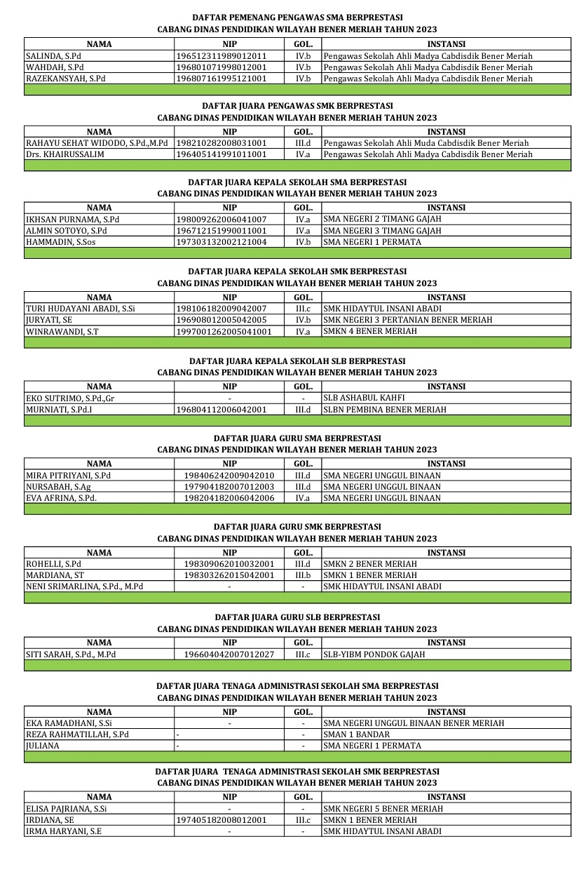 Berikut pemenang seleksi kepala sekolah, guru dan tenaga kependidikan SMA/SMK/PKLK plus pengawas berprestasi Dinas Pendidikan Aceh Wilayah kabupaten Bener Meriah :