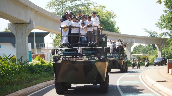 Sebagian anak yatim melambai-lambaikan tangan dan tertawa-tawa tiada henti ketika naik di atas kendaraan militer jenis panser Anoa, produksi Pindad. Pangdam beserta jajaran juga ikut mendampingi para anak yatim tadi dalam joy-ride panser.