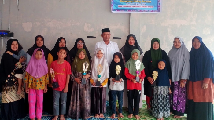 Dalam kegiatan ini juga turut dibagikan tropi dan sertifikat penghargaan kepada pembaca teraktif Perpustakaan Kampung Uning bersah.