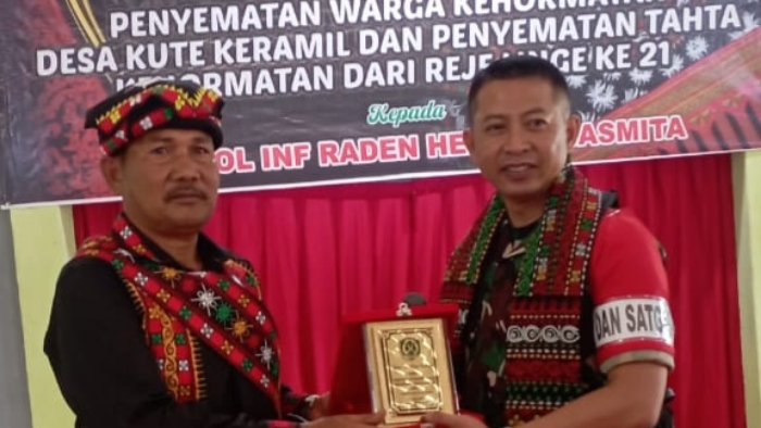 TAKENGON-LintasGAYO.co : Komandan Kodim 0106 Aceh Tengah, Letkol. Inf. Raden Herman Sasmita dianugerahi sebagai warga Gayo sekaligus menerima titah kehormatan dari Reje Linge ke-21, YM Juhursyah dalam prosesi adat di Kampung Kute Keramil, Kecamatan Linge, Aceh Tengah, Senin 3 November 2025.