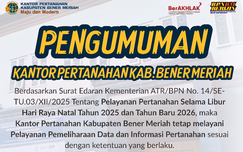 Redelong-LintasGAYO.co : Dalam rangka menjaga keberlanjutan pelayanan kepada masyarakat, Kantor Pertanahan Kabupaten Bener Meriah tetap membuka layanan pemeliharaan data dan informasi pertanahan selama libur Hari Raya Natal 2025 dan Tahun Baru 2026.