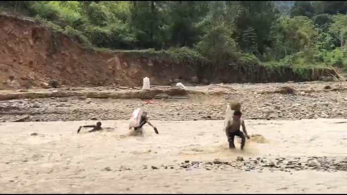 Mau tak mau, masyarakat yang kebunnya selamat dari amukan bencana harus mengangkut hasil panennya melewati sungai, sebagai penopong ekonomi.