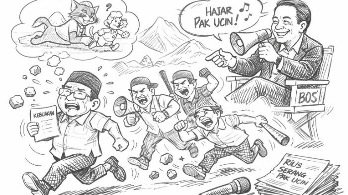 Menariknya, di balik layar, sang atasan yang biasanya jadi tameng justru berubah jadi sutradara dadakan. Dengan suara lirih dan senyum diplomatis, ia berbisik kepada beberapa orangnya: “Hajar saja Pak Ucin.” Sebuah kalimat pendek yang lebih tajam dari bayonet.