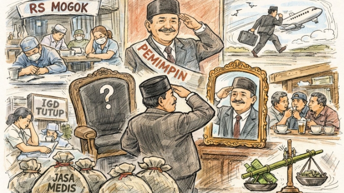 Humor pahit beredar, negeri seberang jadi metafora, kursi kosong berwibawa, dan Pak Ucin menulis takdir, seolah mandat turun dari kabut, bukan proses, bukan tanggung jawab yang jujur, adil, transparan, manusiawi.