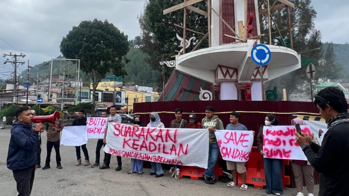 Aksi damai itu dilakukan oleh belasan orang dengan poster bertuliskan Save Sandika dan kawan-kawan, Selasa 3 Februari 2026 di Tugu Simpang Lima Takengon.