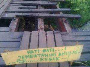 TAKENGON-LintasGAYO.co : Kondisinya yang miring akibat tiang darurat penyangga bantaran sudah lapuk di tambah lantai papan yang juga sudah tak memungkinkan lagi,