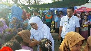 Meureudu-LintasGayo.co ; Menteri Sosial RI, Khofifah Indar Parawansa membagi-bagikan Juz Amma dan Jilbab kepada anak-anak yang keluarganya mengungsi di Gampong Deah Pangwa